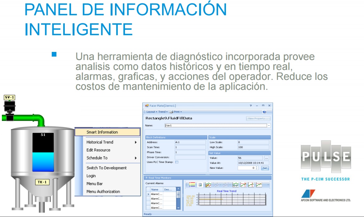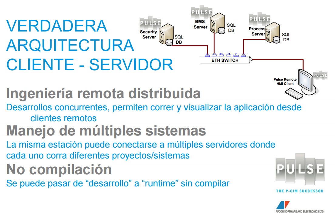 Pulse es un SCADA que perteneció a Schneider bajo el nombre de P-SIM, y ahora es PULSE, de AFCON, es un software con excelentes prestaciones para las industrias con accesos a base de datos muy grandes, con capacidades de control, administración de datos, monitores de alarmas, conexión a celulares, etc.